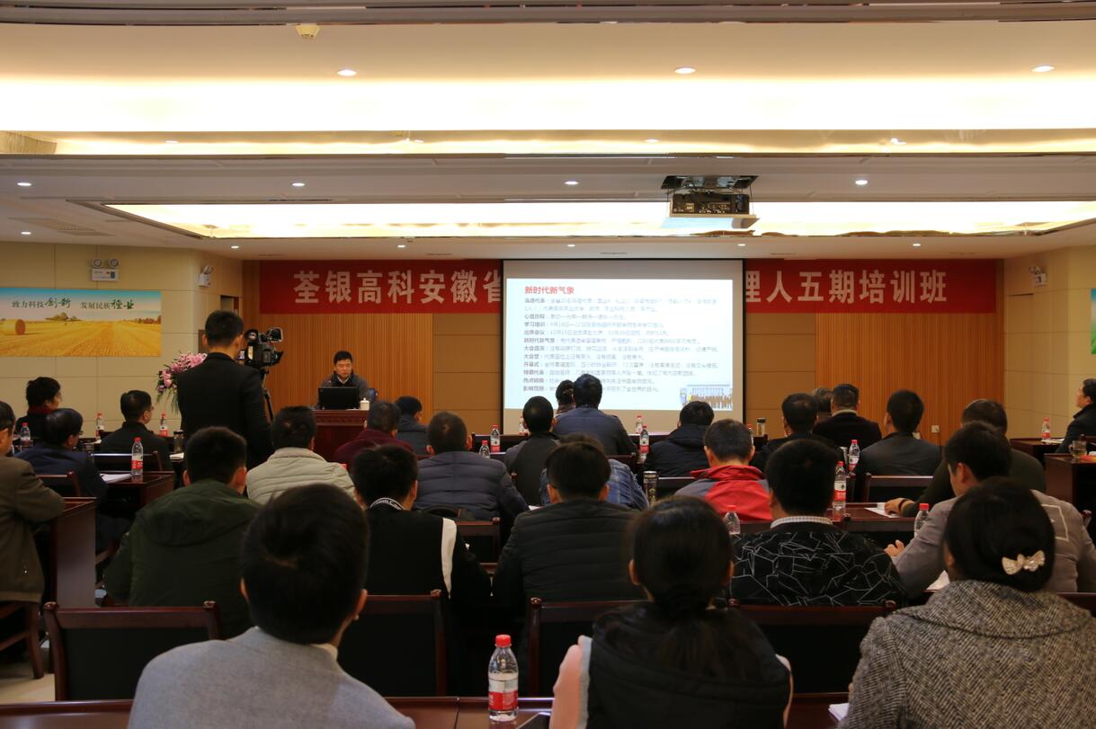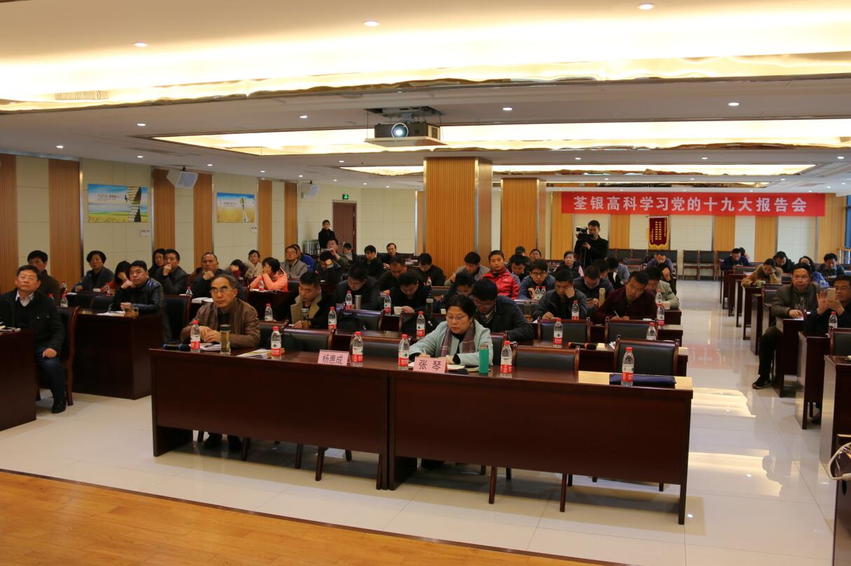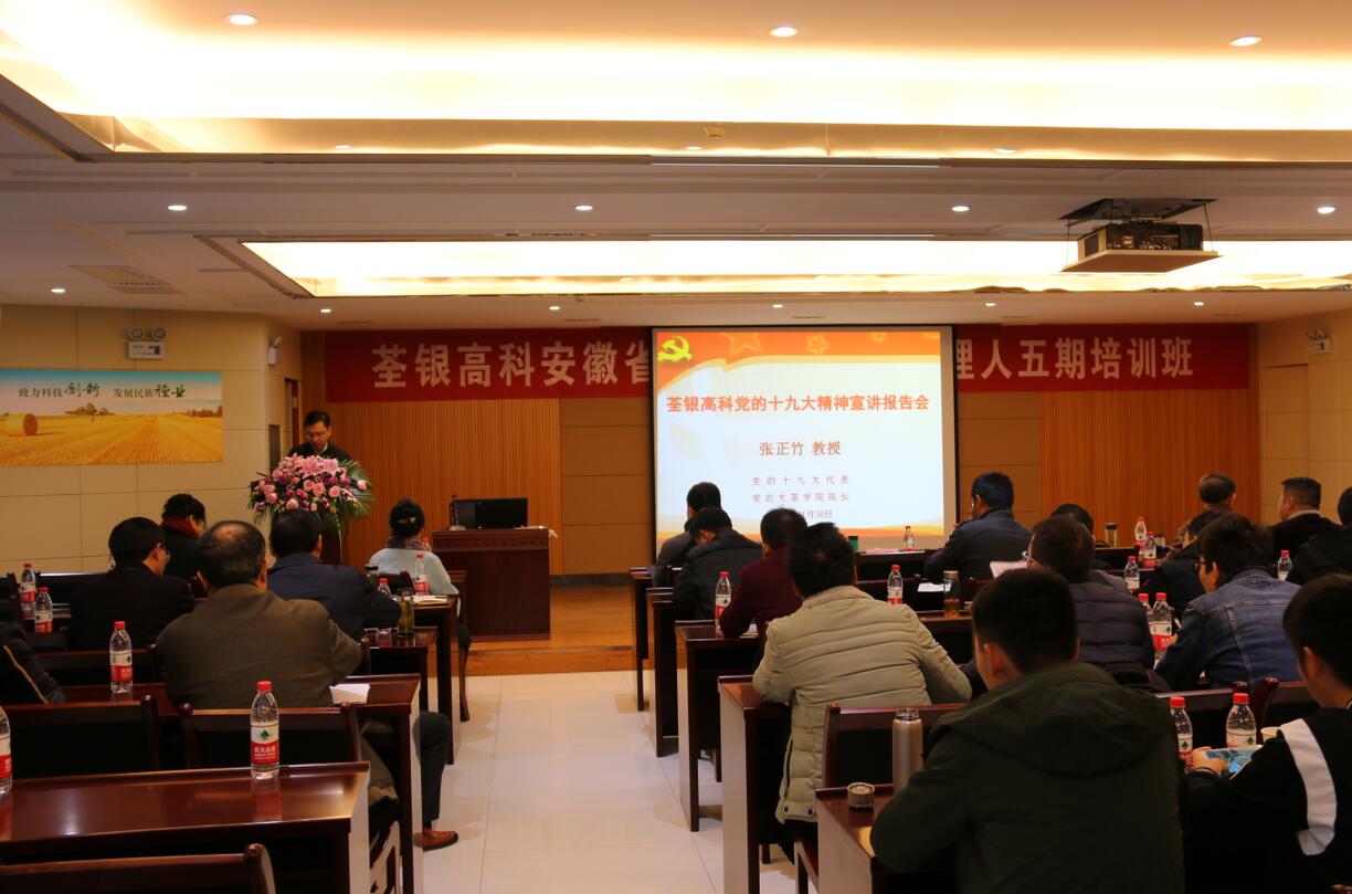 2017年11月30日上午,為深入學習宣傳中國共產(chǎn)黨第十九次全國代表大會精神,荃銀高科邀請黨的十九大代表、安徽農(nóng)業(yè)大學茶與食品科技學院院長張正竹教授來公司作黨的十九大精神宣講。宣講報告會在荃銀高科六樓多功能廳舉行,公司經(jīng)營班子成員、全體黨員、安徽省首屆農(nóng)業(yè)職業(yè)經(jīng)理人學員以及公司部分員工參加了學習。會議由公司黨支部書記廖孝波主持。