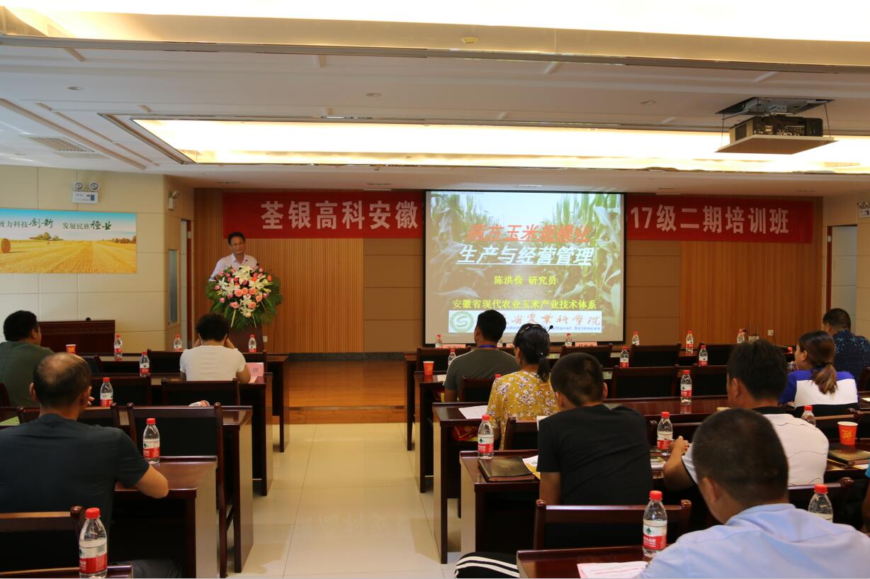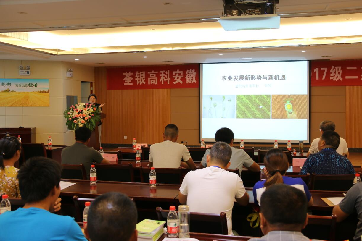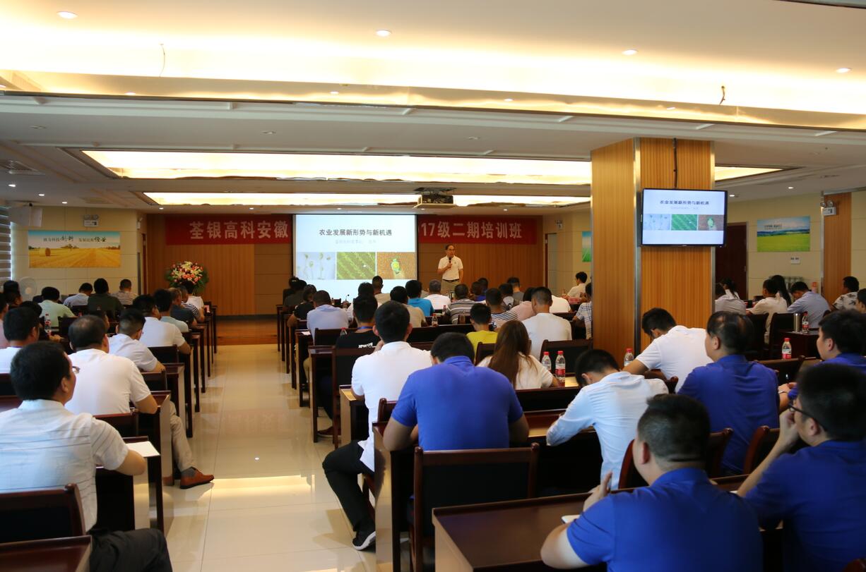 ??? 2018年7月19日,由安徽省農(nóng)委主辦、荃銀高科承辦的安徽現(xiàn)代青年農(nóng)場主培訓2017級第二期培訓活動在公司六樓多功能廳展開。安徽荃銀高科董事長張琴、營銷總監(jiān)王玉林,培訓班總教務長楊惠成老師,安徽張海銀基金會秘書長張彤,及來自全省各地的100多位從事種植業(yè)的農(nóng)場主學員參加了培訓。