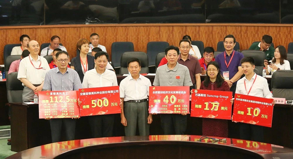 會上進行了基金會2018年公益愛心捐贈儀式。荃銀高科母子公司高管和員工多次參與基金會濟困助學公益慈善活動,本次捐贈112.5萬元;吉林鴻翔種業(yè)集團鴻翔種業(yè)有限公司捐贈10萬元;巴基斯坦Suncrop Group(陽光作物集團)捐贈1萬美元;合肥霍邱經濟文化發(fā)展促進會及會員為基金會貧困助學項目捐贈40萬元;安徽荃銀高科種業(yè)股份有限公司捐贈500萬元。